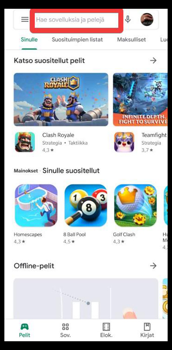 - Lähdetään liikkelle etsimällä puhelimen kotinäytöltä Play Kauppa: