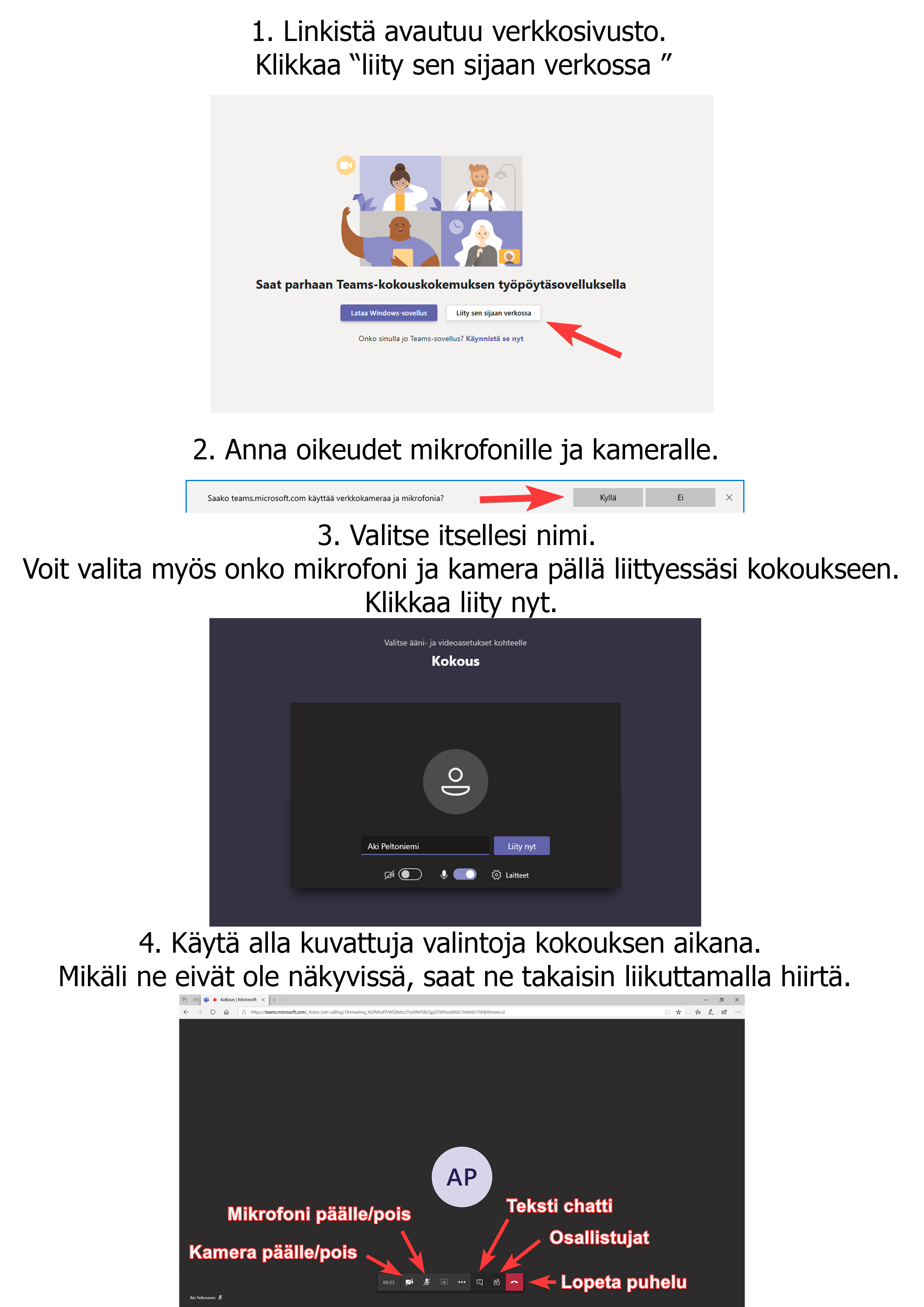 2. Anna oikeudet mikrofonille ja kameralle. "Salli" tai "kyllä" nappula.