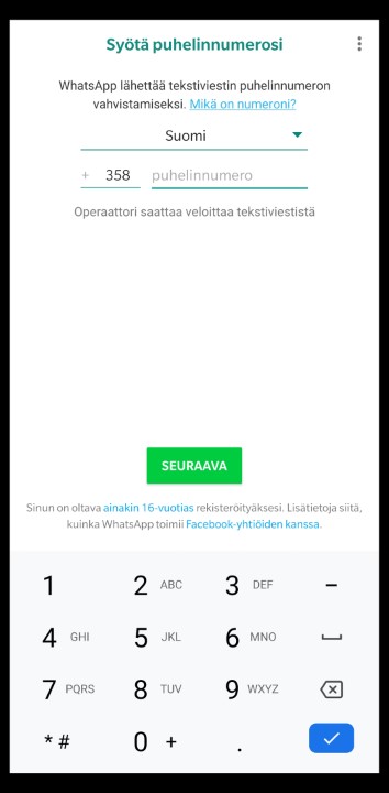 WhatAppin käyttöä varten tarvitsee antaa puhelinnumero